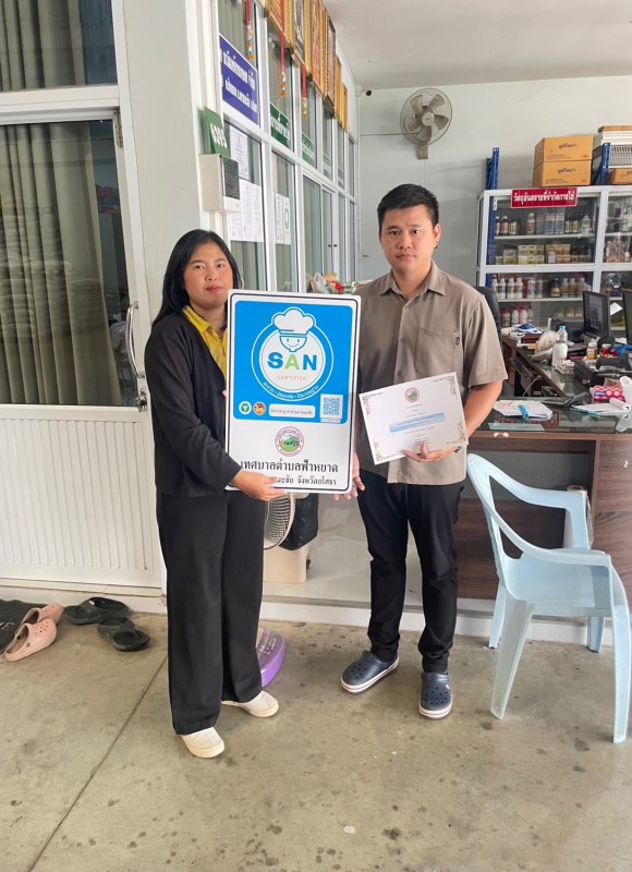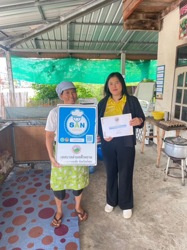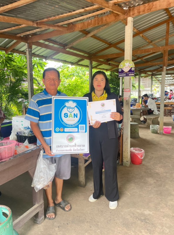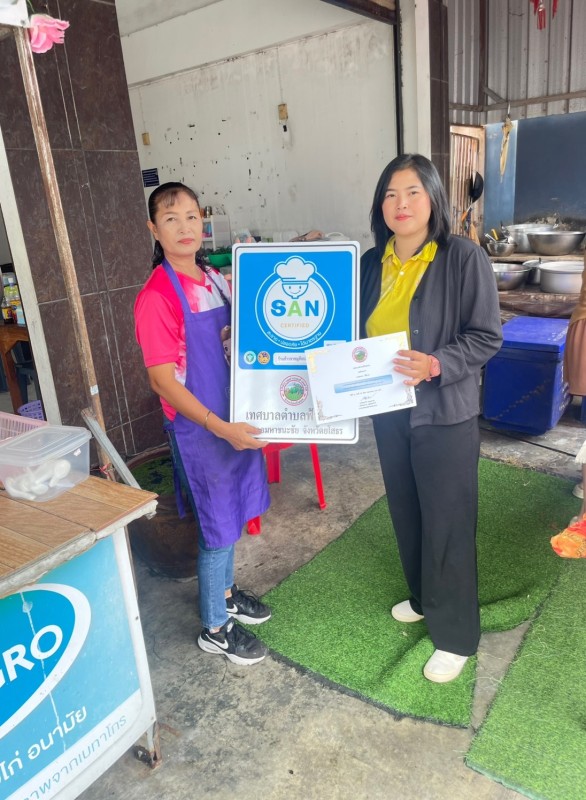 กองสาธารณสุขและสิ่งแวดล้อม ออกมอบป้าย สำหรับร้านอาหารที่ผ่านการประเมินมาตรฐานสุขาภิบาลอาหาร ตามมาตรฐาน SAN ของกรมอนามัย พร้อมมอบใบประกาศให้กับผู้ผ่านการอบรม หลักสูตรสุขาภิบาลอาหาร สำหรับผู้สัมผัสอาหาร ตามโครงการพัฒนาสุขภิบาลอาหารแก่ผู้ประกอบการด้านอาหาร ในเขตเทศบาลตำบลฟ้าหยาด ประจำปี 2568
