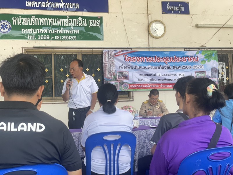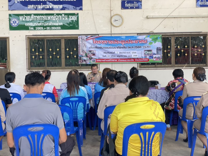 วันที่ 10 พฤศจิกายน 2568 เทศบาลตำบลฟ้าหยาด โดยนายธนารัตน์ แสนเสริม นายกเทศมนตรีตำบลฟ้าหยาด เป็นประธานพิธีเปิดโครงการประชุมประชาคม เพื่อเพิ่มเติมแผนพัฒนาท้องถิ่น (พ.ศ.2566-2570) เพิ่มเติมครั้งที่ 2 ประจำปี 2568 โดยมีคณะผู้บริหาร สมาชิกสภาเทศบาลตำบลฟ้าหยาด ผู้นำหมู่บ้าน ประธานคณะกรรมการชุมชน คณะกรรมการชุมชน ประชาชนหัวหน้าส่วนราชการภายในเทศบาลตำบลฟ้าหยาด เข้าร่วมประชุมประชาคมในครั้งนี้ด้วย