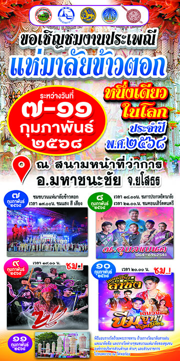 กำหนดจัดระหว่างวันที่ 7 - 11 กุมภาพันธ์ 2568 ณ บริเวณหน้าที่ว่าการอำเภอมหาชนะชัย จังหวัดยโสธร