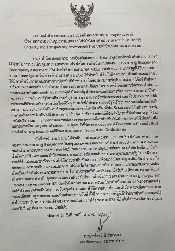 คณะกรรมการป้องกันและปราบปรามการทุจริตแห่งชาติ (ป.ป.ช.) ประกาศผลคะแนน ITA ประจำปี 2568