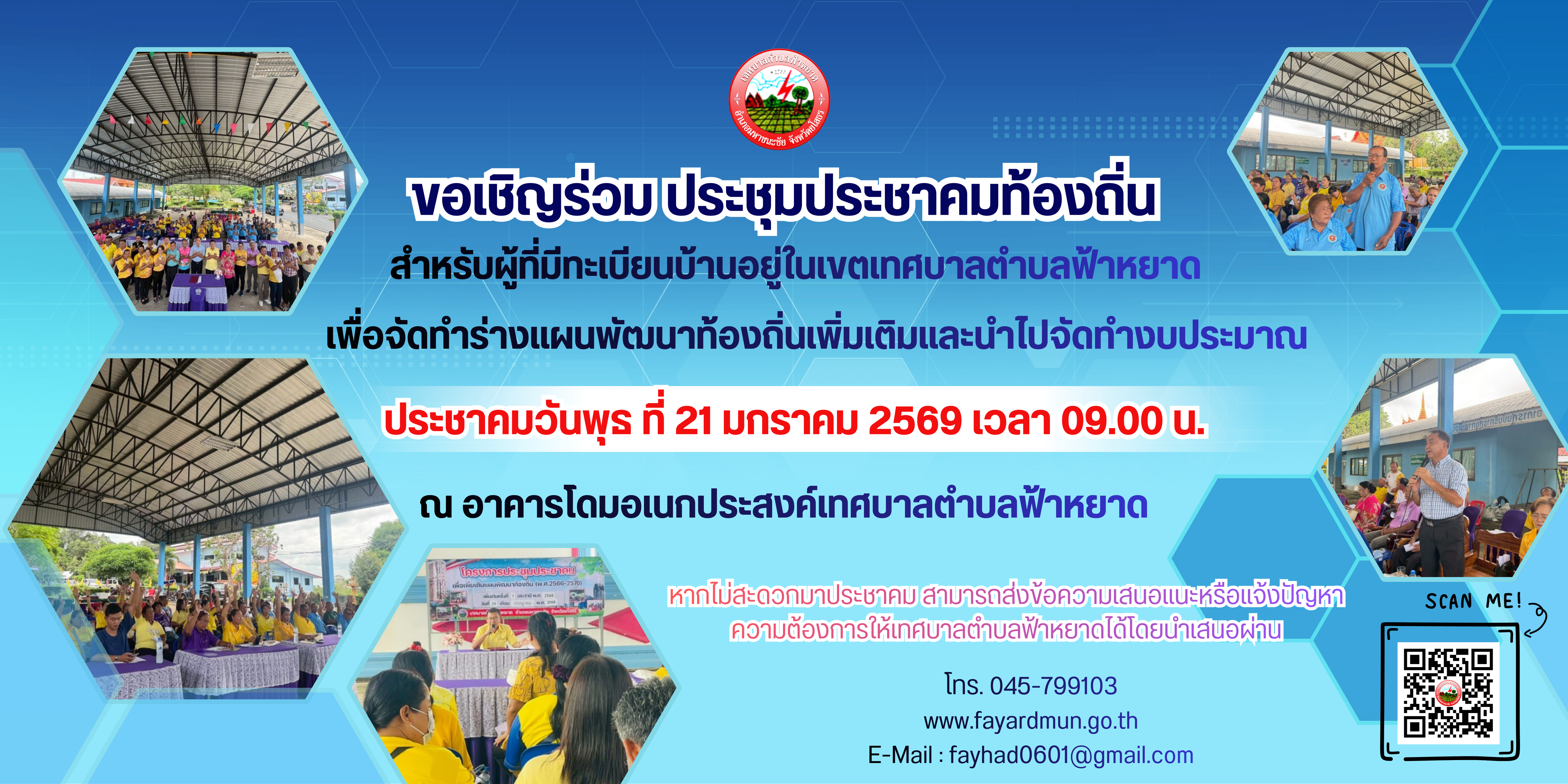 หัวข้อ :: ขอเชิญ....ประชาชนที่มีรายชื่อในทะเบียนบ้านในเขตเทศบาลตำบลฟ้าหยาด ร่วมประชุมประชาคมท้องถิ่น เพื่อจัดทำร่างแผนพัฒนาท้องถิ่นเพิ่มเติมและนำไปจัดทำงบประมาณ ในวันพุธที่ 21 มกราคม 2569 เวลา 09.00 น. ณ อาคารโดมอเนกประสงค์เทศบาลตำบลฟ้าหยาด